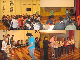 第一站,中午時大家在味香聚餐,餐館內一張張的圓桌圍著舞台中央一字排開,學生們抱著雀躍的表情,一邊享用午餐,一邊觀看表演。首先是由華大的學生Logan Stafman 跟他的朋友一塊兒表演單人,雙人花式的扯鈴表演。扯鈴一會兒忽高,一會兒忽低,一來一往,非常精彩。接著是由出身少林寺的行雪師父為大家帶來精湛的武術表演,紮實的拳法,刀法和雙節棍的演出讓學生讚不絕口。享用午餐以後,第二站是參觀佛光山聖路易禪靜中心。妙涵法師娓娓道來禮佛的道理,用淺顯易懂的比喻讓學生對於佛法有著更進一步的認識。學生除了聽講禮佛,親身體驗冥想,打坐以外,還玩了尋寶遊戲,任務就是找到一大一小相同的法器,佛像,讓學生加深對於佛教文化的概念。
