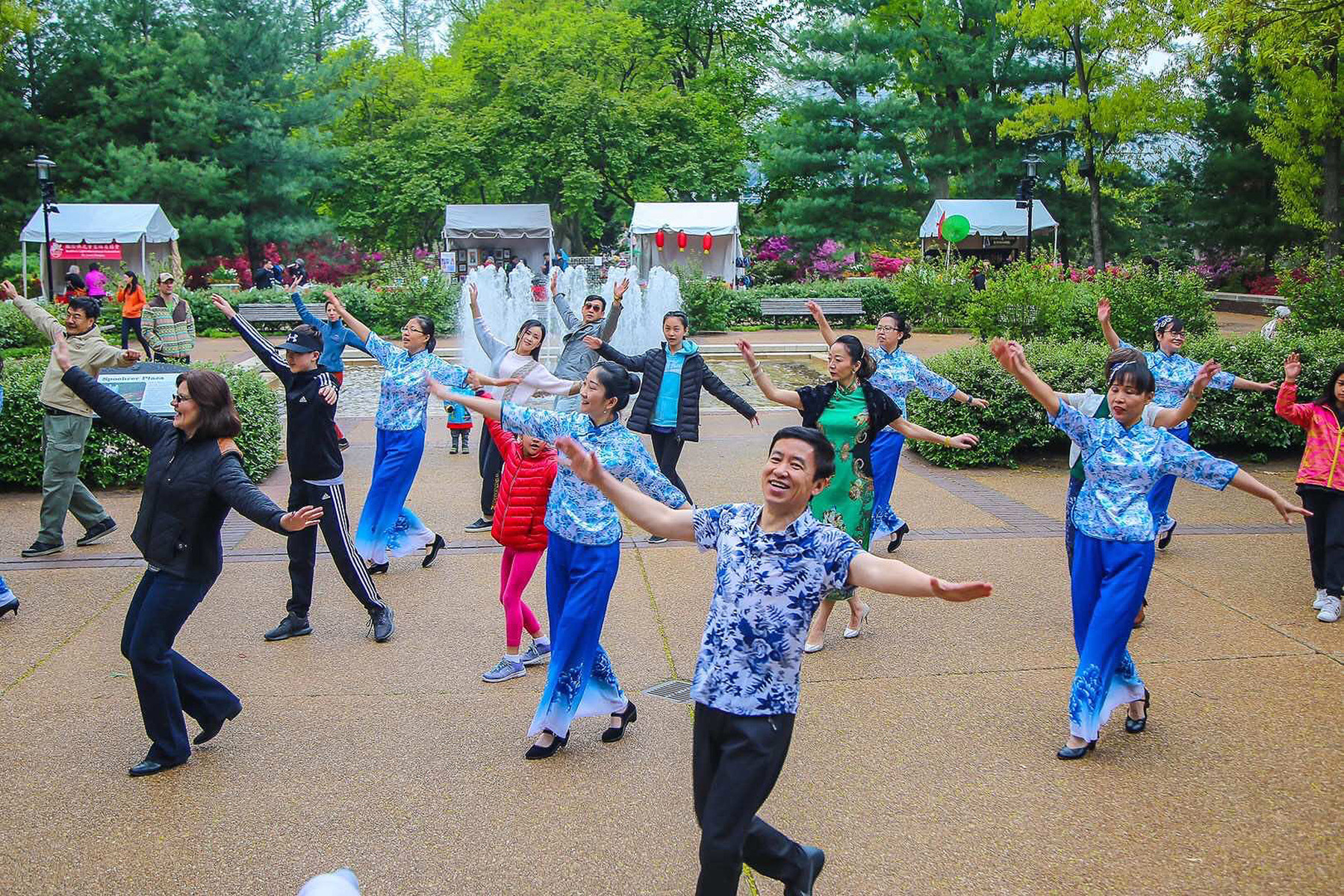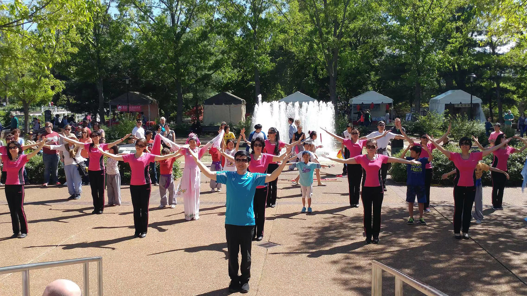 廣場舞於2016年第一次在中華日亮相。廣場舞隊表演了“小蘋果”和紅綢舞,動感的節奏、劃一的舞姿、青春的氣息吸引了大批遊人觀看。有人把廣場舞和西方的Square Dance 做比較,有人對我們用的音樂很感興趣,說跟他們心目中的中國音樂不太一樣,有人要詢問怎麼能得到音樂的拷貝及紅綢子。由於廣場舞第一年得到了方方面面的好評和植物園的讚賞,之後就一直做為中華日的保留節目了。