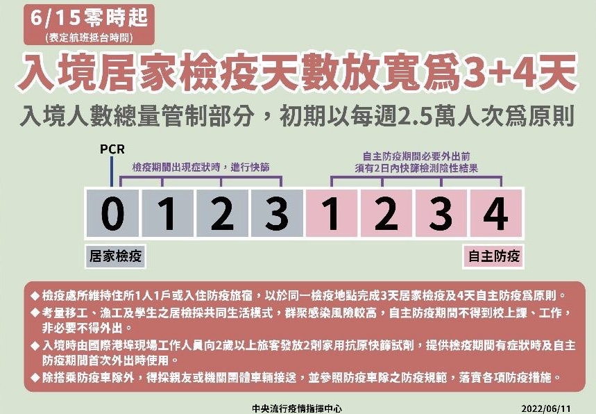 中央流行疫情指揮中心本(6)月11日宣布,考量國際國內疫情及防疫與醫療量能,並促進經濟及社會活動與國際必要交流,自本(2022)年6月15日零時起(航班表定抵臺時間)於調控入境一定人數總量為前提下,放寬相關邊境檢疫措施概述如下: