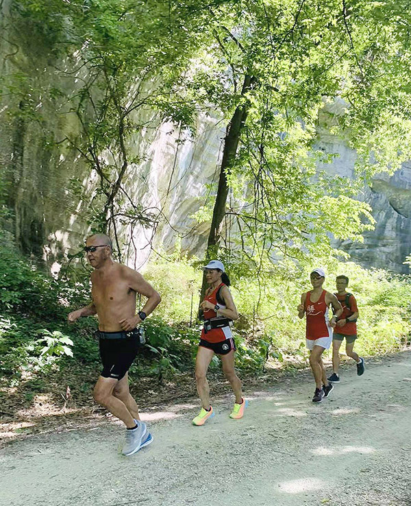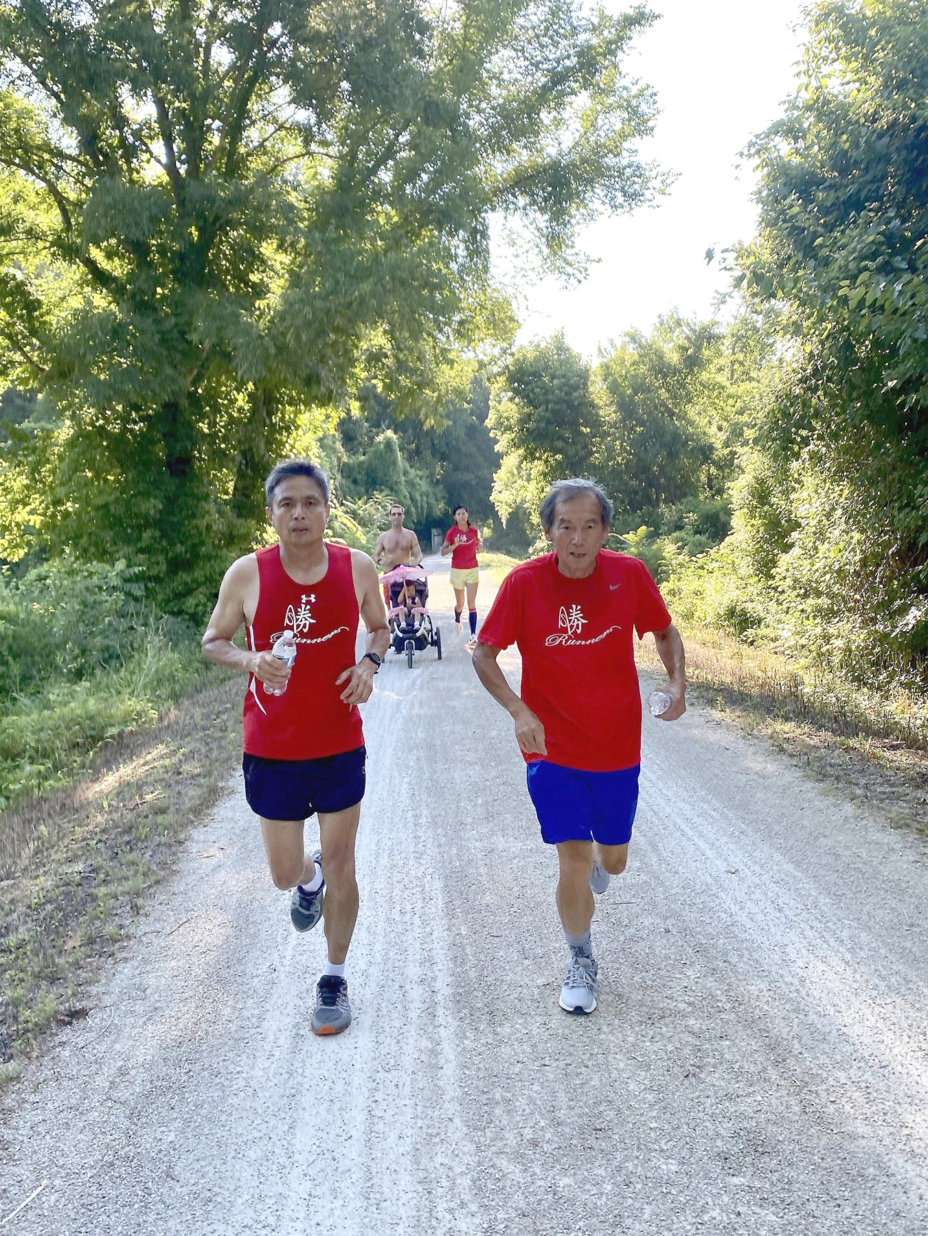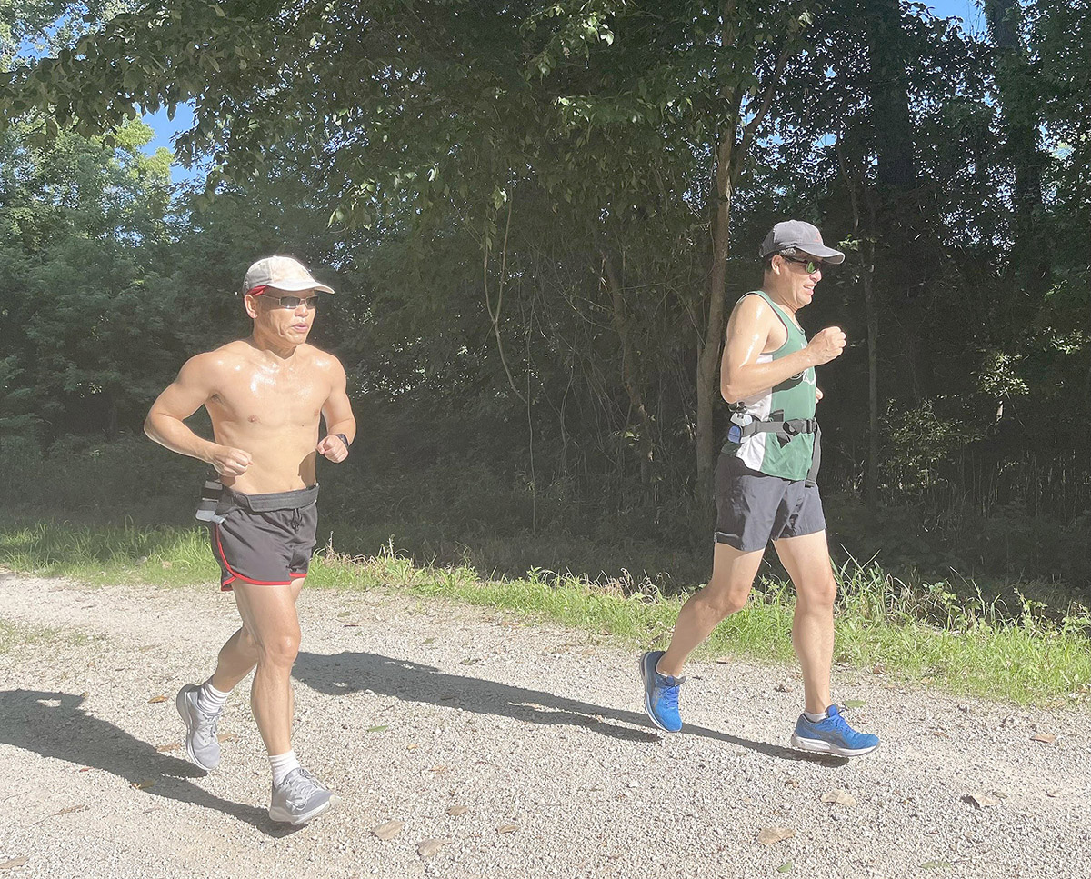 持續一周的高溫,在活動當天早上突然降至60多度,氣候宜人。聚會以跑群獨有方式開始,早上8點首先進行群跑,從Klondike 公園出發,在美國最長,由廢棄鐵路改建而成的遊樂徑Katy Trail 跑步。各人量力而為,速度相近的自行結合,邊跑邊聊。