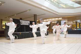 除了太極拳及劍,趙女士還教太極扇。陳式太極扇四十八式是在陳式太極拳的基礎上,融合陳式太極拳的風格特點,結合各種扇術動作編排而成的武藝健身套路。趙女士把太極扇的纏繞折疊,輕靈沈穩及多變的扇術打得淋漓盡致。去年她領隊在聖路易植物園中華日表演,全隊優美多變的扇術,動作和音樂渾然一體的表演深深地吸引著觀眾。表演結束後幾位對太極扇有興趣的老美也加入了學習太極扇的行列。趙女士有條不紊,深入淺出地將這四十八式一招一式的介紹,更特別強調需要掌握的動作要領,讓大家不斷地重覆練習。剛接觸到太極扇時,我們在變換扇術間,不知把扇子甩出去了多少次。甚至在冰天雪地的嚴冬特地去中國店把店裏僅存的幾把扇子全買了下來,以備不時之需。 趙女士傾囊相授,大家也都勤加練習。幾個學期下來每位學員對太極扇都掌握了些竅門,也打得順心應手了。在趙女士詢問大家對外表演的意願時,溫蒂說:[我們可是一定要參加的。因為這樣才能讓大家看到在老師的教導下,不只是華人,連美國人也可以把太極扇打得令人賞心悅目。] 表演那天連八十開外手肘不慎跌傷的學員琴吉都綁著繃帶坐在觀眾席上捧場。