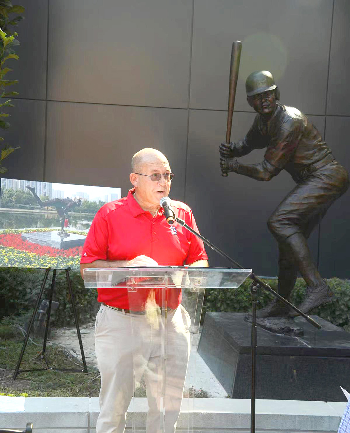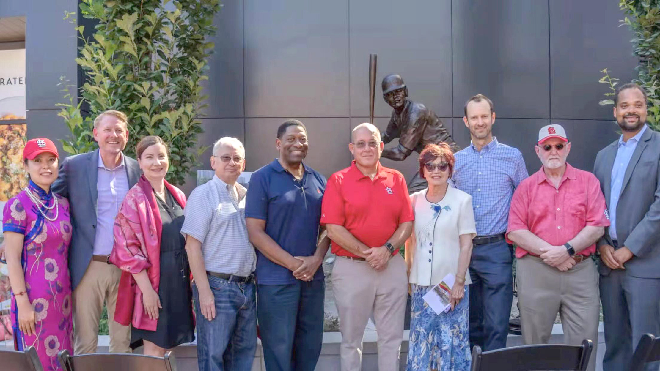 下午3:30,友城協會會長Neal Perryman致辭,正式拉開了雕像揭幕儀式。在聖路易斯著名企業家Tim Hermann、何建萍夫婦共同剪綵下,雕塑正式展示在廣大市民面前。在場的嘉賓、球迷和遊客一起見證了這個激動人心的時刻。這也是自疫情以來迎來的第一個交流項目。Joel Glassman和戴慶齡兩位友城協會的元老也特別感慨,喜見友誼之路,綿遠流長。在隨後當晚比賽的間隙中,紅雀隊也向全場數萬觀眾宣報了這個喜訊。這必將成為大家今後的一個參觀打卡地。