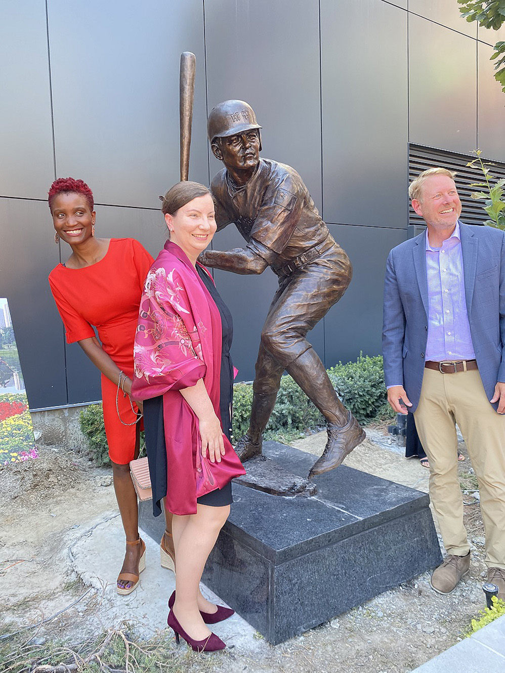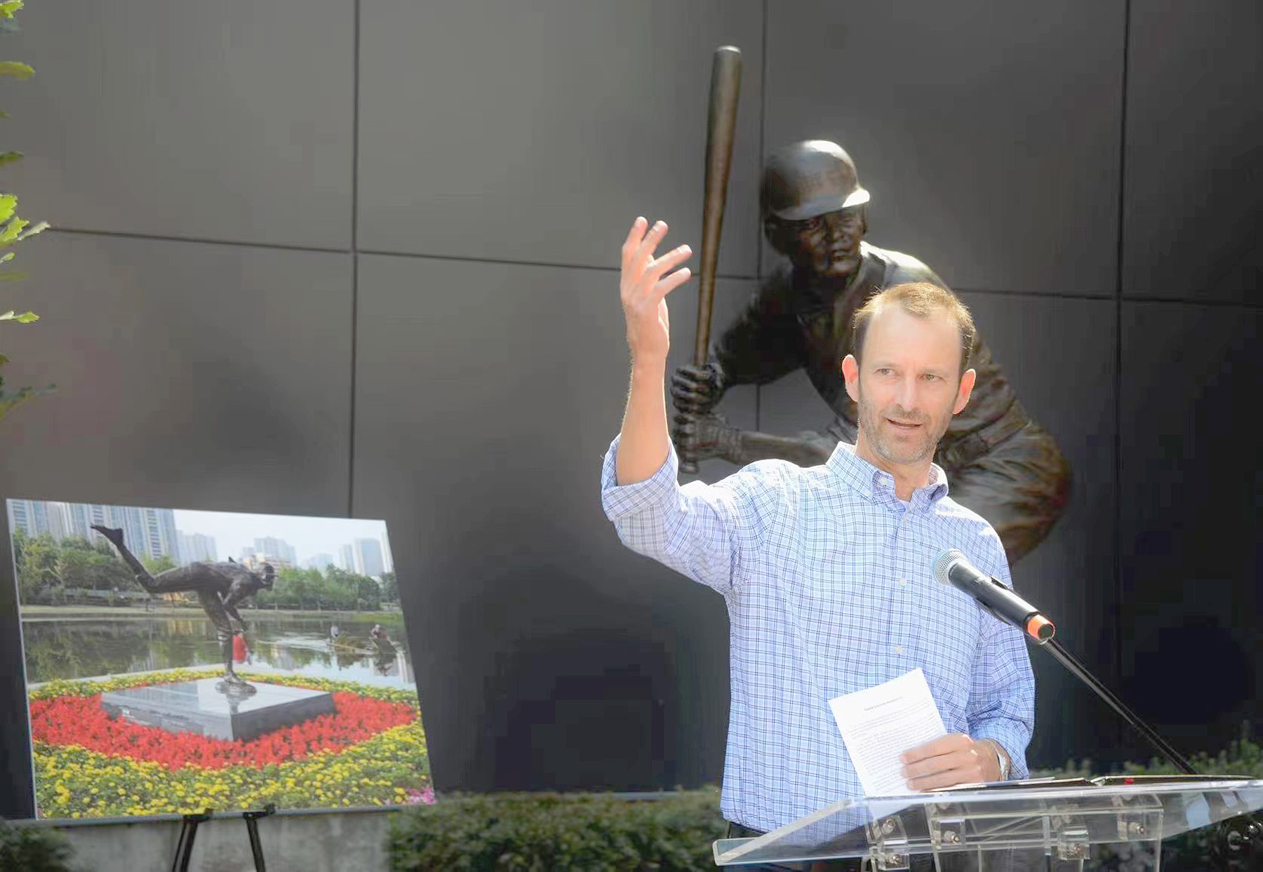 3時許來自聖路易斯–南京友城協會的委員們、紅雀隊的經理、聖路易斯市、郡的官員代表,聖路易中華文化教育中心的代表,以及社區各界友人和當地媒體一眾聚集在這座雕塑前。原來這是紀念美中之間第一對友好城市:聖路易斯–南京兩市結好40周年紀念的雕塑。這座雕塑由聖路易斯著名雕塑家哈裡韋伯(Harry Weber)設計,一共製作了一組,兩座雕塑。第一座已經在2019年贈送並落成在友城南京國際友誼公園,在南京的投球手雕塑造型是以紅雀隊的著名大投手亞當溫賴特(Adam Wainwright)為原型。雕塑朝西擺放,球手面朝聖路易斯方向。這次在聖路易斯的雕塑造型則是一名擊球手,其造型是一名中國運動員,球員背號是象徵40周年的“40”,頭盔上印有“南京”兩個字。