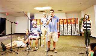 今年文化中心的《品美食‧慶中秋》的另一大亮點是文藝節目比以往更加精彩、更加風趣、更加精悍。首先是閻明老師的小星星兒童歌曲聯唱,孩子們唱得也非常瀟灑自如、自信。聖路易斯大學的大學生們表演的《中文情景對話》劇碼,內容貼切、情景到位。不但表達了“每逢佳節倍思親”的中華優良傳統,更展現了中華民族對家庭的愛、對家人的愛以及尊老愛幼的優良美德。太極拳是中華文化的重要組成部分。這次朱明輝老師的學生上臺表演的陳氏太極更是太極中的太極,柔中有剛、內外合一、形意俱練。卡拉OK俱樂部在孟錦部長的帶領下不負眾望,在晚會上表演的《小蘋果》效果不同凡響,場面十分激動人心。由舞社改編的《紅色娘子軍》舞蹈節目,是一出幽默、搞笑、懷舊的壓軸戲。舞蹈中美麗女孩翩翩起舞,威武的軍人英俊瀟灑、機智幽默,把陽剛之氣和美麗柔性巧妙地和諧結合到了一起,也把晚會推向了頂峰。