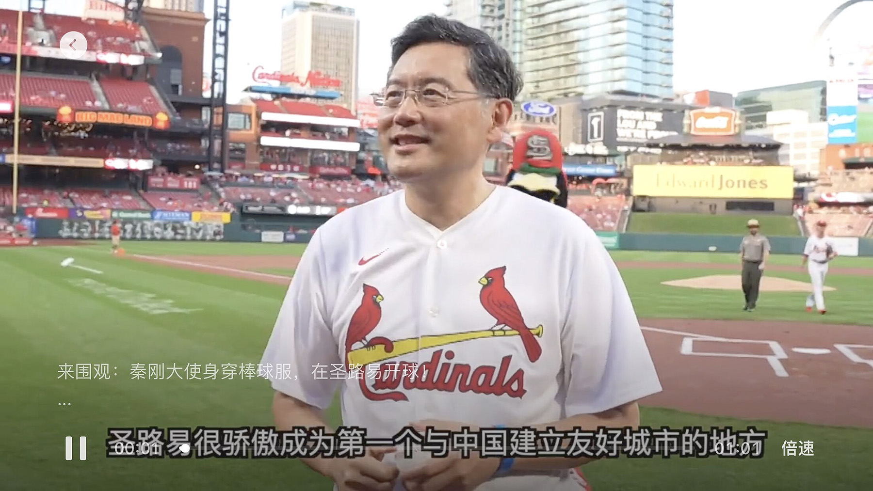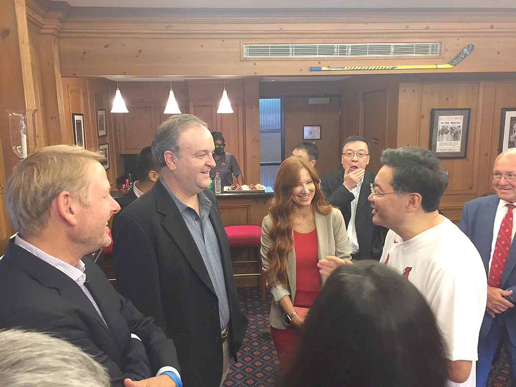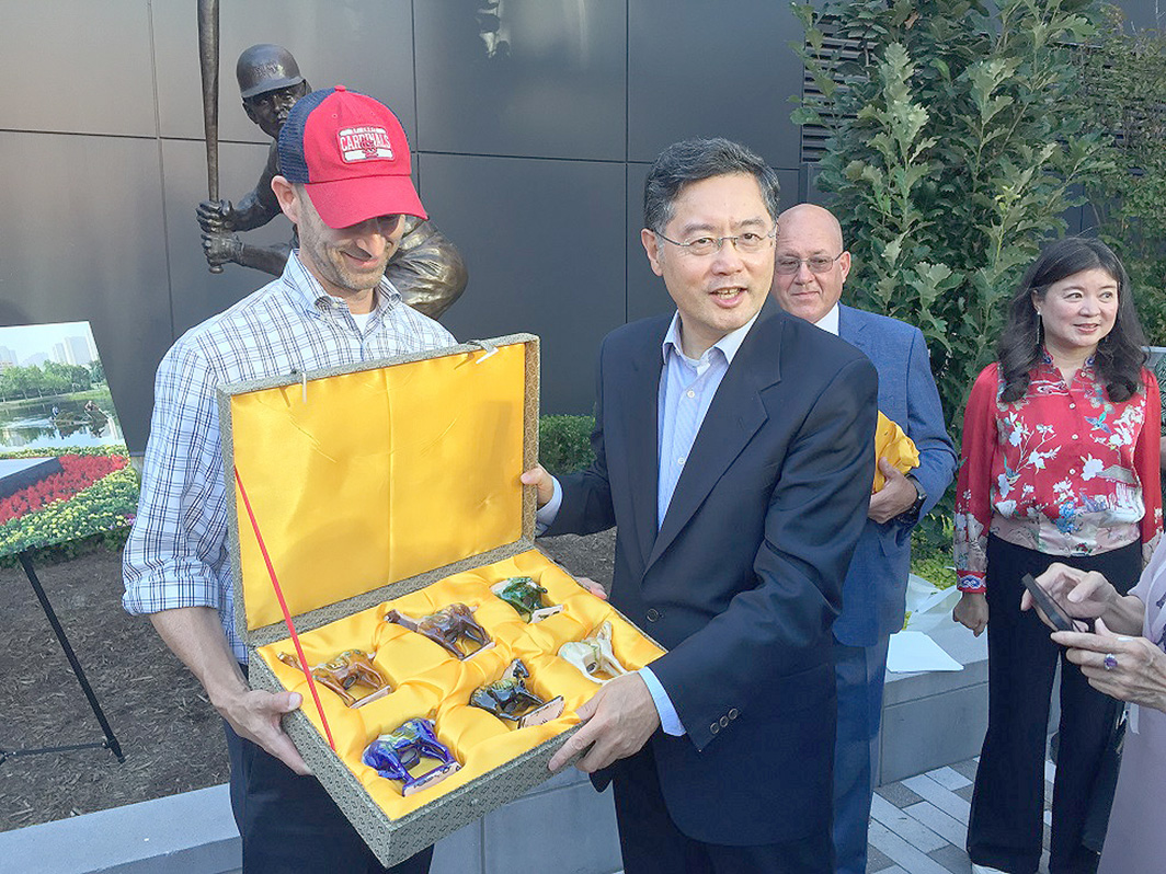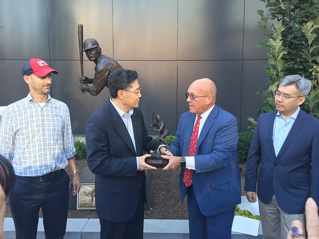 秦剛大使表示非常榮幸訪問中美之間的第一個友城聖路易斯市,並到訪著名的聖路易斯紅雀棒球隊主場體育場Busch Stadium。秦剛大使致辭道:”南京擊球手”雕像象徵著中國南京市同美國聖路易斯市過去43年來開展廣泛、卓有成效的姐妹城交往合作的結晶,也是中美43年雙邊關係歷程的縮影。兩座雕像,相隔萬里,將中美兩座跨越太平洋的城市緊緊聯結在了一起。秦大使相信聖路易斯市作為西部開拓的起始地,將帶著兩城、兩國的友誼沿著當年西進的道路連綿不斷一直向西,跨越太平洋,直至西岸的中國。