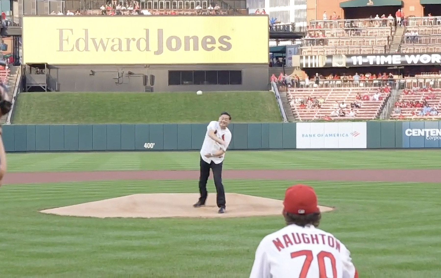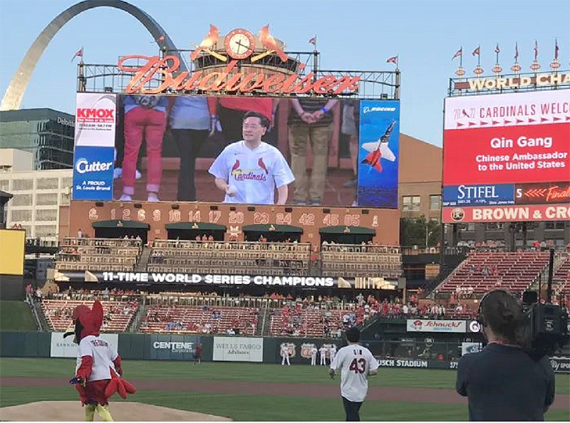 隨後秦剛大使與友城協會、以及Cardinals球隊互贈禮物。秦大使還身披Cardinals隊特地為大使準備的象徵友城43周年的Cardinals特製隊服進入場地中央為當日比賽投球開賽。秦大使的“投球開局“與南京市的投球手雕塑恰巧遙相呼應。