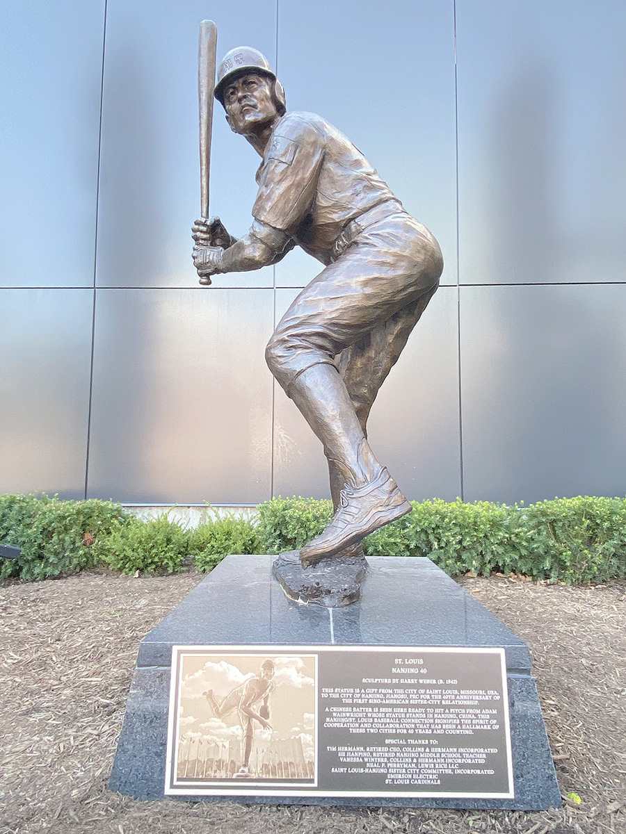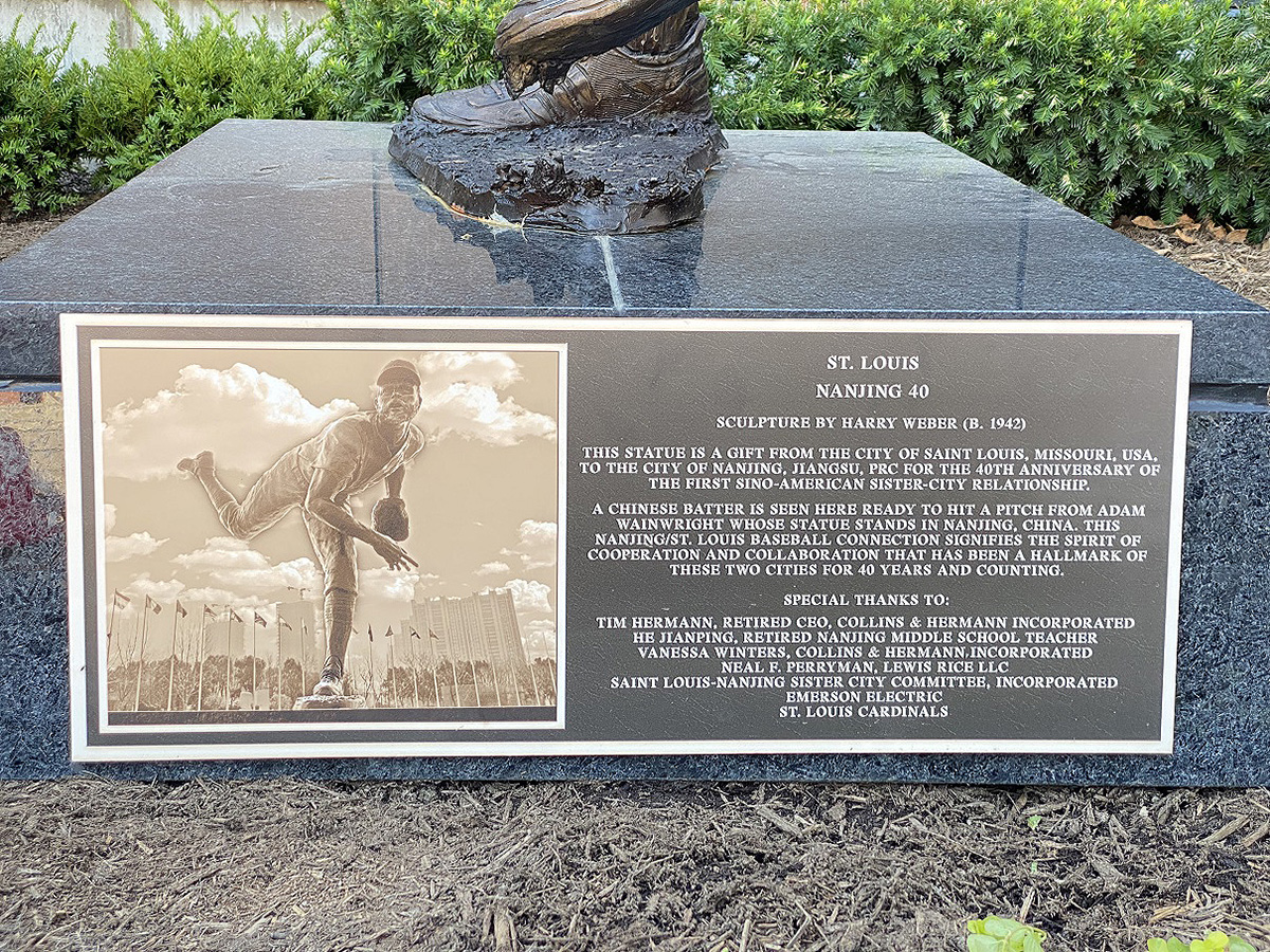 九月十五日日下午,數萬Cardinals的球迷蜂擁而至到聖路易斯Cardinals的Busch體育場。又是一個風和日麗的比賽日,今天體育場迎來了一位貴賓:中國駐美大使秦剛。秦剛大使此次前來是特地參加坐落在Busch體育場邊的聖路易斯-南京友城紀念雕塑”南京擊球手”雕塑銘牌揭牌儀式。這座聖路易斯的雕塑與位於南京友誼公園的投球手雕塑為一對同胞雕塑。“南京擊球手”以中國運動員為造型,呈準備擊球狀,棒球帽和球衣上印有中文“南京”字樣,球衣背號是象徵兩市結好40周年的40號。(歡迎大家去體育場打卡)
