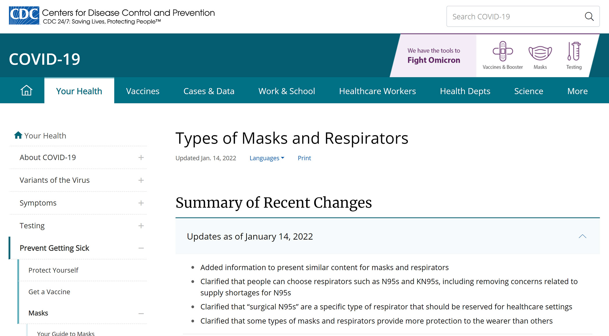 CDC於一月十四日發佈了最新的口罩指南,指出高品質的N95和KN95口罩對COVID-19提供最好的保護,前提是它們是按照NIOSH標準製造的。該機構警告說,使用未經批准的、劣質的口罩可能會使佩戴者更容易感染病毒。N95是美國標準,KN95是中國標準。“N”代表非油性顆粒物,“95”代表防護級別最小值達到95%,N95和KN95在日常生活中都能提供較好防護。