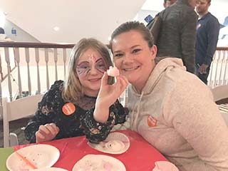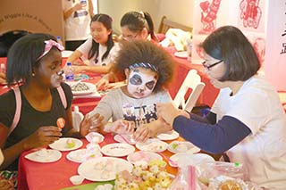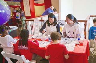 由六位志願者岳文芊、張嘉儀、Jennifer Li, Amy Ma 、Lily Bartin 和Aaron Fausz , 負責的兒童臉譜是最受歡迎的展臺,她們忙而不亂,耐心地滿足每位小朋友的需求,讓每個小朋友高高興興地變身成自己喜愛的形象歡度中國年。書法展示體驗台陳勇,汪燕飛, 陳心瑞和陳安然全家上陣。她們鬧中取靜,為小朋友和家長介紹傳統書法,許多小朋友在她們的鼓勵下都揮毫潑墨,奮筆疾書。在李淋老師指導下, 朱紅梅,張沁萌, 于美琪同學用普通面材製作出了許多種活靈活現的小動物。一個個憨態可拘的小豬,小雞吸引了很多小朋友和家長,在老師的啟發和幫助下,小朋友們一會兒功夫就為自己做好了農曆中國年的吉祥物。手工剪紙展臺的 唐瑞秋,吳非魚和楊鈺姍同學,巧手如織,指導小客人們用一張普普通通的紅紙剪出小豬。希望為大家帶來紅紅火火,吉祥如意的新年。