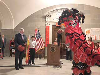 2月4號(大年三十)的傑弗遜(密蘇里首府)寒風凜凜,但在密蘇里州政府內卻熱鬧非凡。受Mike Parson州長的邀請,來自聖路易中文學校,哥倫比亞中文學校以及密蘇里州的各界人士在州政府內齊聚一堂, 正在歡慶中國農曆新年。這次慶祝活動由密蘇里勞動和勞資關係部主任許心怡女士主持, 她也是密蘇里州歷史上第一位華裔內閣成員。州長,副州長以及州內閣的主要成員均參加了這次慶祝活動。慶祝活動在聖路易中文學校舞獅隊的鑼鼓聲中拉開了帷幕。只見紅色的獅子隨著鼓點,時而跳躍, 時而疾走,時而眨巴著大眼睛,時而又扇扇小耳朵,時而活潑,時而威武。在現場觀眾的一片喝彩聲中,獅子準確的接住了Parson州長拋出的繡球。
