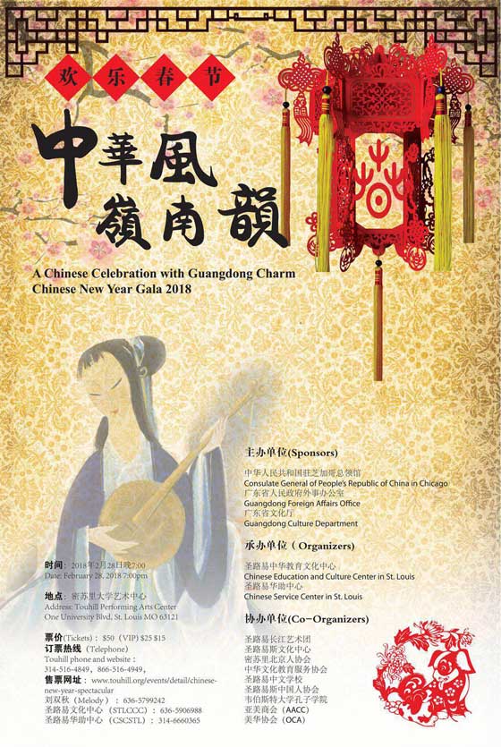 由中華人民共和國駐芝加哥總領館、廣東省人民政府外事辦公室及廣東省文化廳主辦,聖路易中華教育文化中心,聖路易華助中心承辦,“中華風‧嶺南韻”大型華人春節聯歡晚會將於2018年2月28日晚7:00于聖路易斯密蘇里大學Touhill表演藝術中心隆重舉行。屆時來自於中國著名的廣東藝術團將在此登臺獻藝,聖城著名的表演藝術家也將同時與國內嘉賓們同台亮相,給父老鄉親帶來新春的祝福。大家有機會領略國內超高水準的表演同時,也可以感受中華文明的博大精深及嶺南文化的獨特韻味。