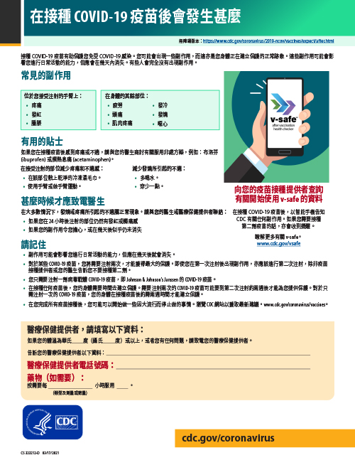 如果您接種了COVID-19疫苗,並且認為離開疫苗接種地點後可能會出現嚴重過敏反應,請立即致電911尋求醫療護理。