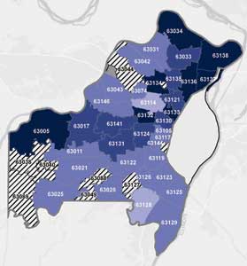 密蘇里州於四月八日下午兩點,發佈有三千三百二十七名確診感染冠狀病毒。感染冠狀病毒的病人中聖路易郡有一千三百零二人、聖路易市有四百七十六人、聖查爾斯郡兩百五十四人,聖路易郡有二十六名死亡、聖路易市有十二名死亡、聖查爾斯郡有六名死亡,密蘇里州共有八十六名死亡病例。聖路易市與郡也發表各郵遞區號感染人數統計,詳細資料可至聖路易市與郡的政府網站查看。