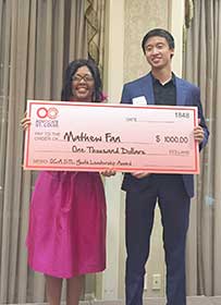 而本次晚會另一個重頭戲是頒發青少年領袖獎學金,獲獎人分別是就讀於St. Joseph's Academy高中的第四代日裔Tiffany Sakamoto,以及John Burroughs高中的華裔Matthew Fan。今年OCA的實習生Malaya Siy也上台致詞,發表她擔任實習生這一年的感想與收穫。