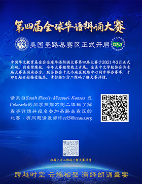 中國華文教育基金會全球華語朗誦大賽第四屆大賽已於2021年3月正式啟動。由於疫情緣故,今年大賽繼續採用線上展開。全美中文學校協會為本屆大賽美國承辦方,聯合協會十九個地區聯絡中心同步舉辦賽事。聖路易斯賽區初賽於即日起開始接受報名,密蘇里州、南伊林諾州、堪薩斯州及科羅拉州等地區的同學們請密切關心大賽進展,儘快報名參賽!