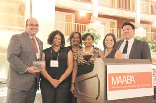 今年的晚宴由餐前菜與雞尾酒交誼時間展開序幕,與會嘉賓陸續到場註冊、彼此寒暄、認識與交流,許多政商名流,包括聖路易郡長Charlie Dooley先生、密州最高法院法官George Draper先生與其夫人聖路易郡41區法院法官Judy Draper女士、美華協會OCA-STL會長Thong Tarn先生、副會長Rita Chu、基督教華服中心羅彥豪博士夫婦、碎心市王恩隆議員等人也都親臨現場參加與祝賀,精彩的日本太鼓演出將氣氛炒到最高點。交誼時間過後,主辦單位各社團會長主席進行簡短致詞後,隨即由MAABA董事會成員Angela Yee小姐頒發2012 MAABA Summer Public Interest Fellowship給就讀於聖路易大學法學院的Huihong Qiao (喬繪紅) 小姐與華大法學院的Deanna Tran小姐,她們將利用這一筆獎學金分別於暑假至St. Louis Volunteer Lawyers and accountants for the Arts與U.S. Department of Veteran Affairs實習。接下來,MCBA的Ronda Williams小姐頒發了2012年The Joint Initiative Diversity Awards獎項給Bruce Hopson先生 (Individual Award Winner) 與Greensfelder (Law Firm Award Winner)所獲得。晚會最高潮的2012 MAABA Torch Bearer Award火炬獎,則是由MAABA創辦人之一,曾任MAABA會長的聖路易郡41區法院法官Judy Draper女士所獲得,Draper女士從James Robinson先生手中接過火炬獎後發表了簡短的得獎感言,她表示:「她在法律界的奮鬥歷程,創辦MAABA十二年來的經過,雖然艱辛,但是今晚聯合晚宴的成功正是展現密州尊重與支持法界多元多樣性的一個重要證據與里程碑。」