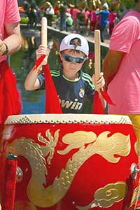 大遊行結束以後,一位小遊客體驗一下大鼓的音響效果