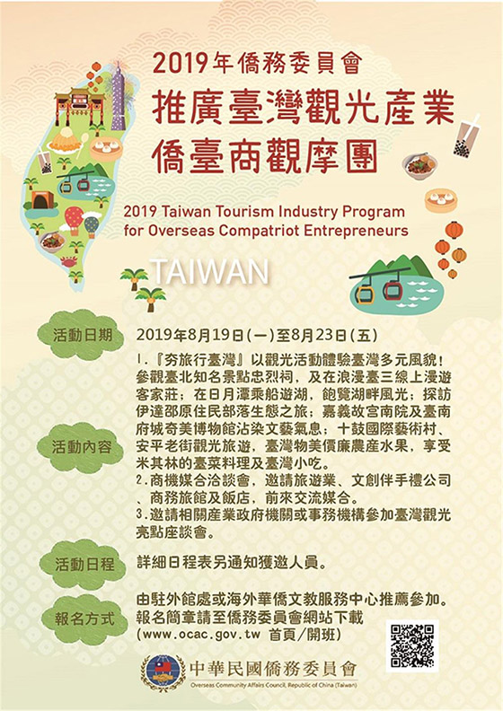 為配合政府當前加速投資臺灣政策,結合海外僑臺商力量,建立僑臺商與國內觀光產業交流平臺,以帶動來臺投資及產業發展,協助國內相關產業開創海外通路及商機,本會訂於本年8月19日至8月23日舉辦「2019年僑務委員會推廣臺灣觀光產業僑臺商觀摩團」,歡迎在僑居地從事觀光相關事業僑臺商報名參加。活動內容包括參訪臺三線客家庄、日月潭與原住民部落、故宮南院、奇美博物館、十鼓文創園區、安平老街、忠烈祠等具臺灣特色行程暨品嚐臺灣美食和探索特色文創,以及拜會觀光產業政策機關、產業專題演講,舉辦「商機媒合洽談會」與十餘家旅遊業、文創伴手禮公司、商務旅館業者交流商機,邀請相關產業政府機關出席「臺灣觀光亮點座談會」等。