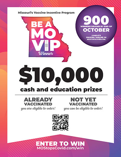 密蘇里州州長於日前宣布將提供一萬美元作為鼓勵人們接種疫苗的獎勵,此計劃被稱為密蘇里疫苗激勵計劃 (VIP)。在接下來的三個月裡,九百名已經或準備接種疫苗的密蘇里居民將贏得價值一萬美元的現金或教育儲蓄賬戶的獎品。至少接種了一劑 COVID-19 疫苗的密蘇里州居民現在可以參加比賽,贏取九百個獎項中的一個。此外,負責COVID-19 疫苗接種的地方公共衛生機構現在也有資格為每位疫苗接種者提供最高二十五美元的經濟獎勵。資金將由聯邦政府資助的 COVID 救濟資金來開展這項全計,全計畫金額將高達一千一百萬美元。