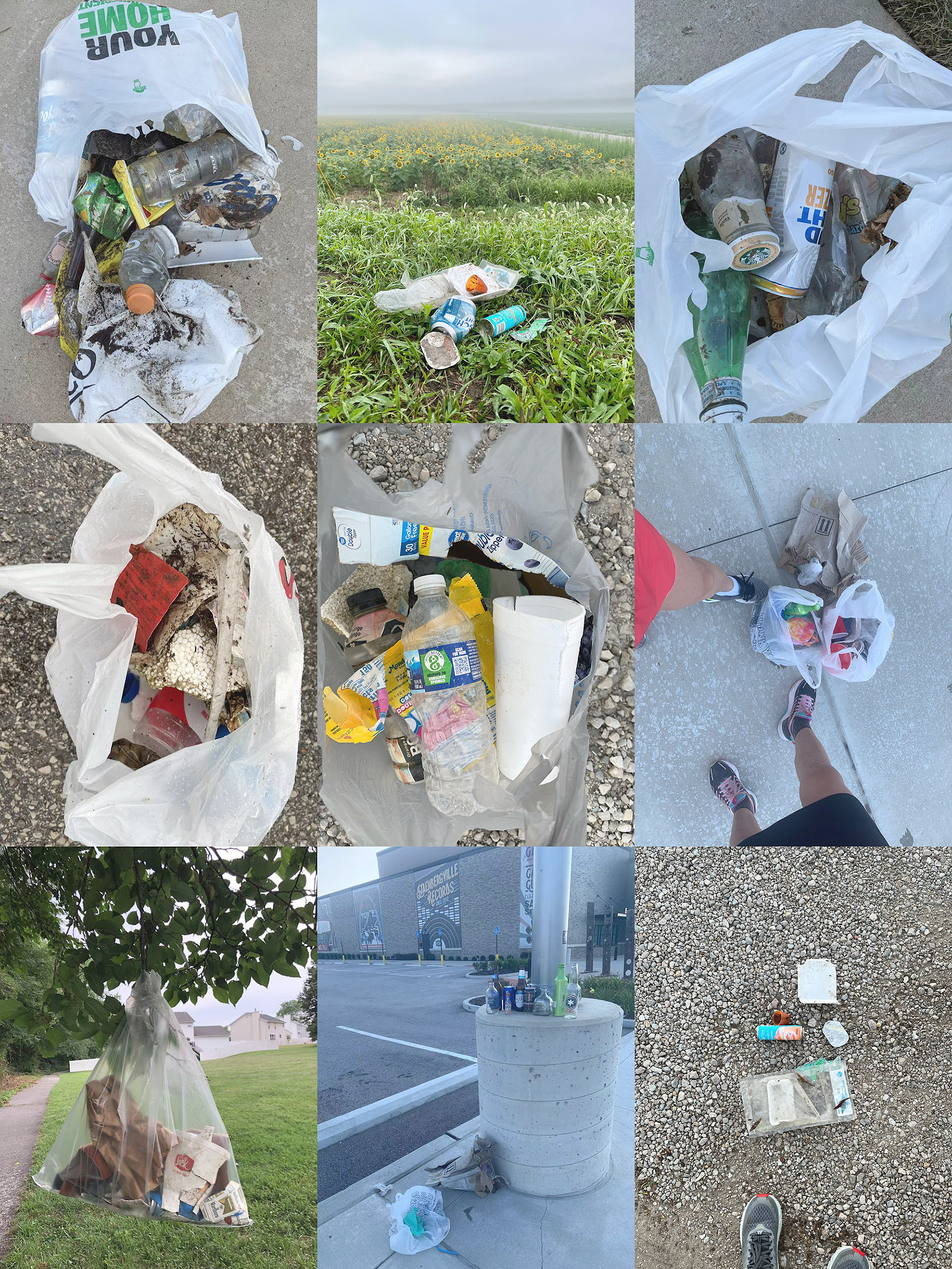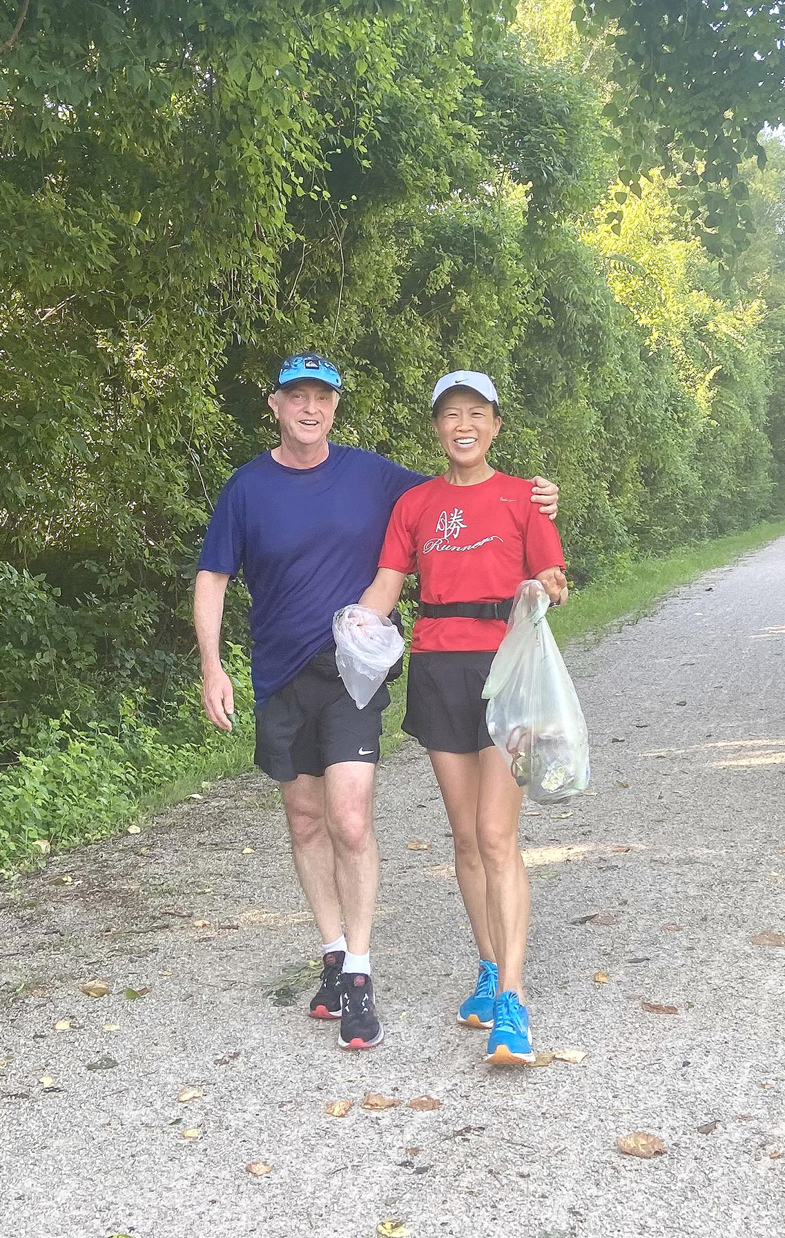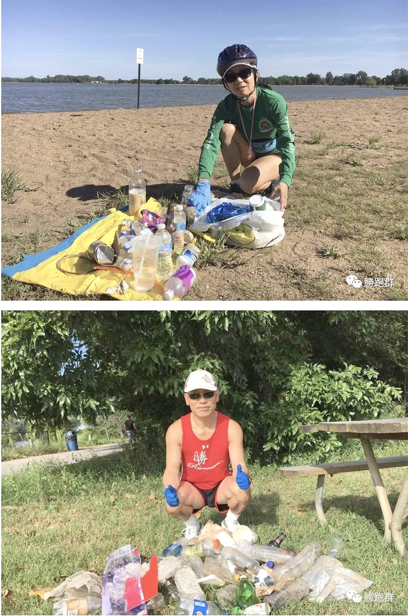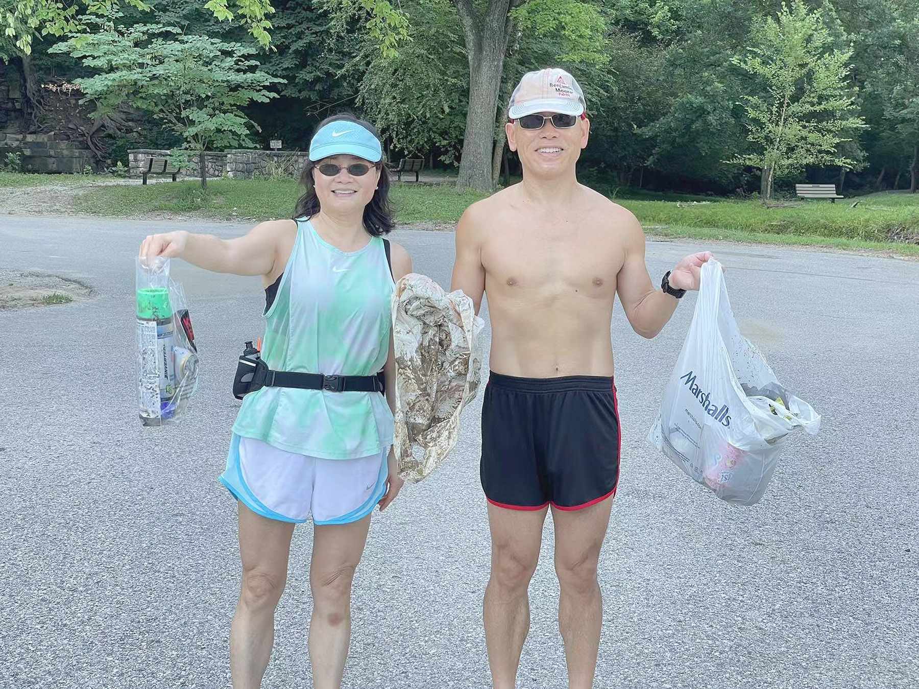 「第一次撿是在我平時跑步的Creve Coeur Lake,我太太騎車我跑步,我們各帶一個手套和一個shopping bag當垃圾袋。原來以為垃圾不會太多,….現在才發現有些散步人多的路段,還有沙灘和水邊,散佈了不少垃圾,像塑膠瓶、包裝袋、酒瓶等,我們最後裝了兩大袋垃圾。這期間還有一兩位散步的人好奇問我們在撿什麼,知道是撿垃圾都點贊說謝謝。」朱露培教授在2019年接受採訪時說。