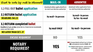 申請郵寄投票不需任何理由,但選票需要公證,選票要在十一月三日大選日晚上七時前收到才能生效,但是郵局強烈建議選票應在十月二十七日以前寄出以確保有效。
