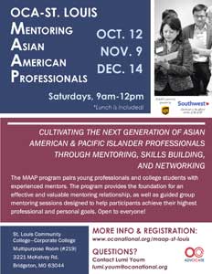 全美最大亞裔人權團體美華協會(Organization of Chinese Americans,簡稱OCA),將於十月起一連三個月,在聖路易推行亞裔專業培訓計畫(Mentoring Asian American Professionals program,簡稱MAAP)。歡迎有興趣擔任導師或接受輔導的青年報名。