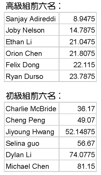 STLRCC這次比賽分成兩組,初級組和高級組進行。原定每位選手三次的比賽成績取平均值來作為最後比賽的結果。比賽中選手們覺得三次還不過癮,強烈要求加賽一場,最後是每位選手的四次比賽的平均成績來作為結果核算成績。其中特別值得一提的是,來自Ladue高中的Sanjay Adireddi凝神屏氣,十指翻飛,瞬間解魔方,以平均用時8.9475秒獲得第一名,他在本次比賽的最好成績是8.27秒。他也是STLRCC的魔方老師之一,這次比賽結束後,立馬漲粉無數。