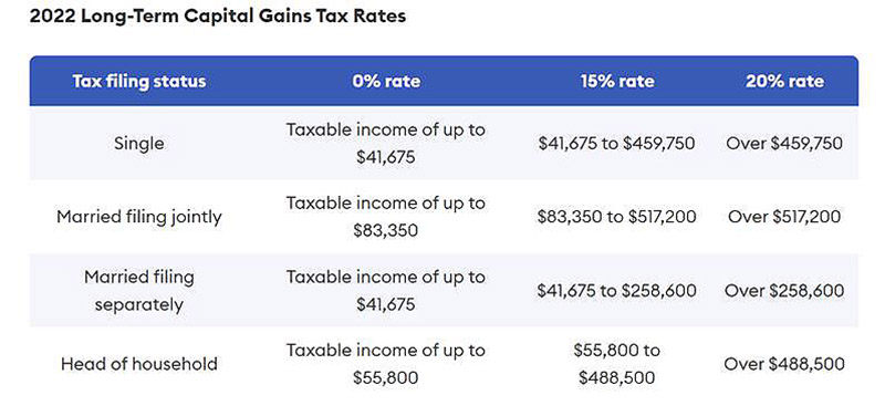 根據國稅局最新發佈的2022年的稅率(表一), 長期資本獲益的稅率按收入高低有0%,15%和20% 。