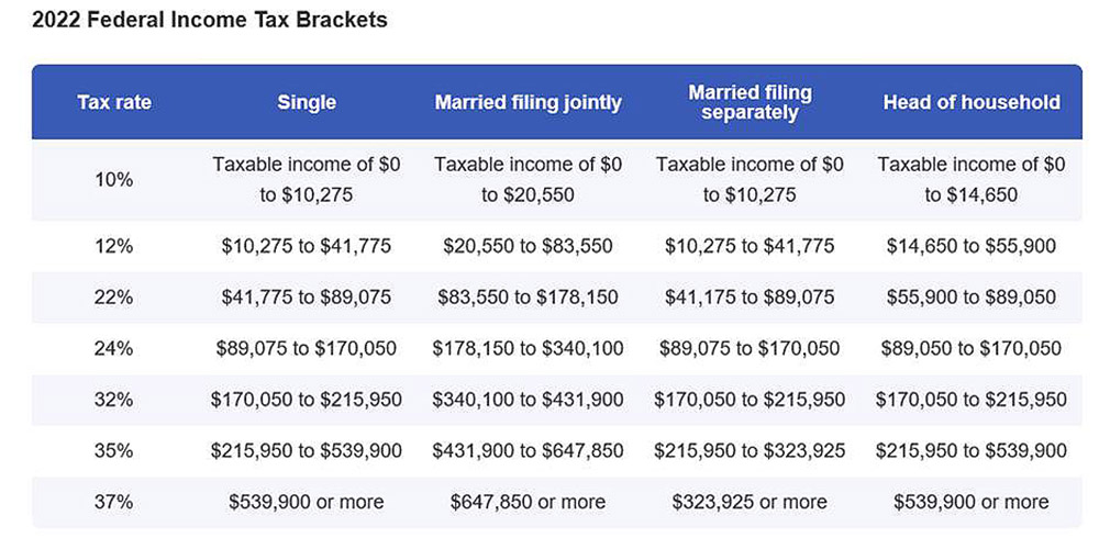 如果持有虛擬幣少於1年時間, 賣出虛擬幣後的獲利 (賣出時的市場價格減去買進幣的價格)按照聯邦個人收入的稅率繳稅。 下面是美國國稅局最新發佈的2022納稅年度的稅收通脹調整(表二)。