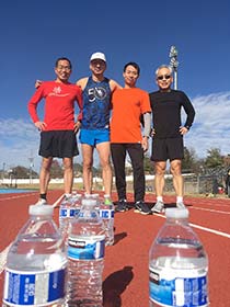 左起:黃建生、章軍、陳華平、朱露培在比賽後的餘興節目中,表演一英哩內分三段喝三瓶水的跑步神技,比跑步和喝水的速度以及胃容量。
